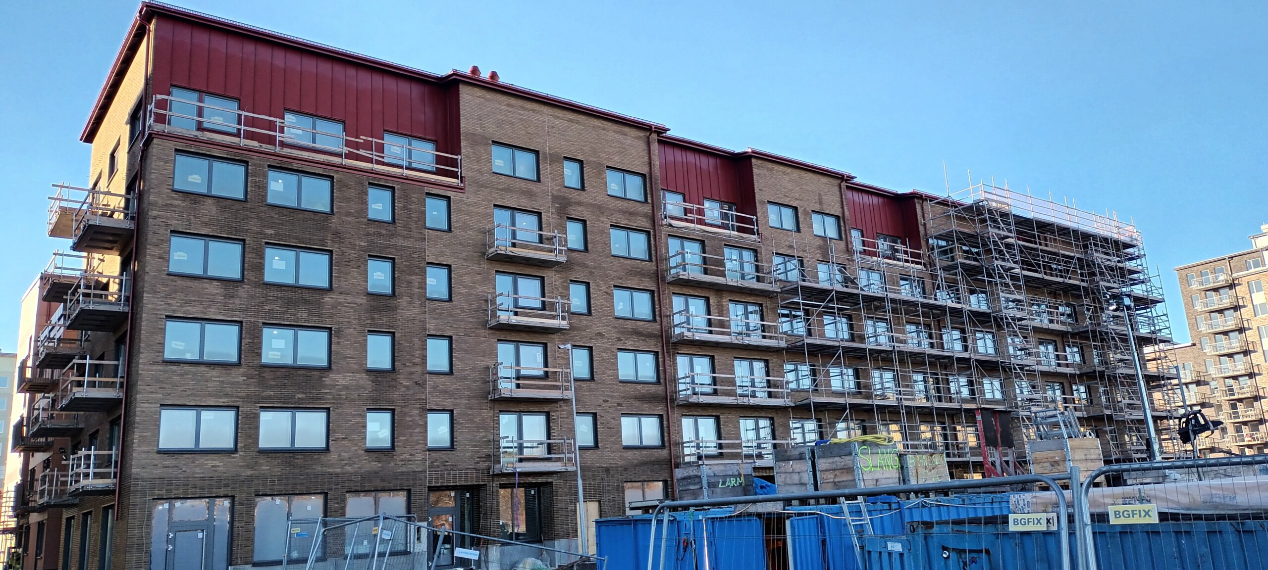 Uppdraget omfattar tätskikt på både terrasser och balkonger, där långsiktigt skydd och hållbarhet står i fokus. På fasaderna utför vi plåtarbeten som inkluderar socklar och trösklar vid balkonger, väggtäckning på terrasser, krön samt fönsteromklädnad med fönsterbleck, överbleck och smyglister.